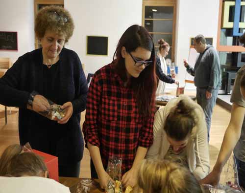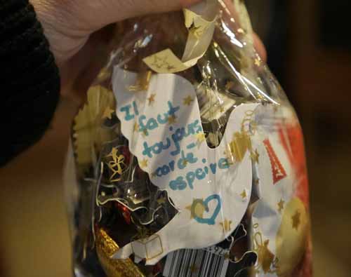 Vendredi nous avons confectionné des petits paquets remplis de douceurs, biscuits, chocolats et chacun a ajouté dans ces friandises un symbole de son choix, un coeur, un trèfle à 4, une colombe avec un petit mot de réconfort comme chance, amour, espoir et rire